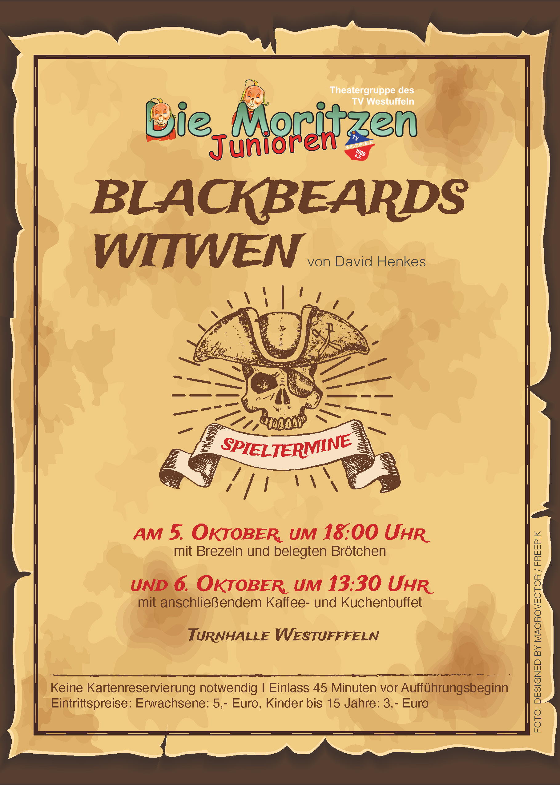 Am 5. und 6. Oktober 2024 hat die wieder neu gegründete Jugendtheatergruppe „Die Moritzen Junioren“ mit 16 Schauspielerinnen und Schauspielern auf der Bühne in der Westuffler Turnhalle gestanden und das Stück „Blackbeards Witwen“ von David Henkes aufgeführt.